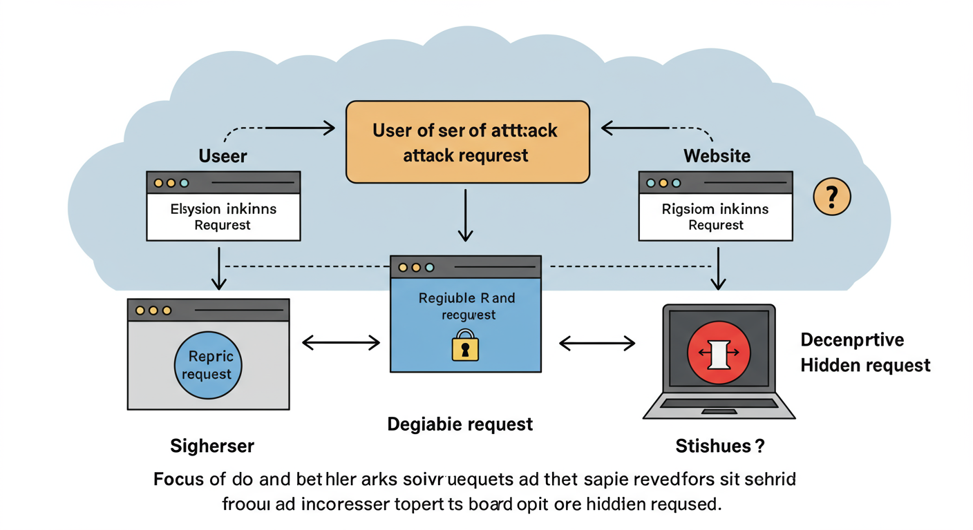 • Vorbereitung: Der Angreifer erstellt eine bösartige Webseite, die ein Skript oder ein HTML-Element (z.B. ein verstecktes Formular oder ein -Tag) enthält, das eine Anfrage an die Zielanwendung sendet.