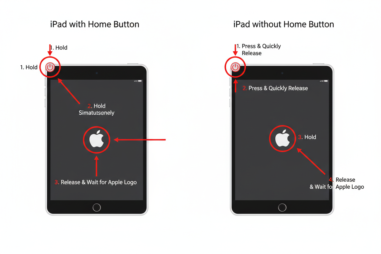 - Halten Sie die obere Taste erneut gedrückt, bis das Apple-Logo erscheint. Lassen Sie dann los, und das iPad startet neu.