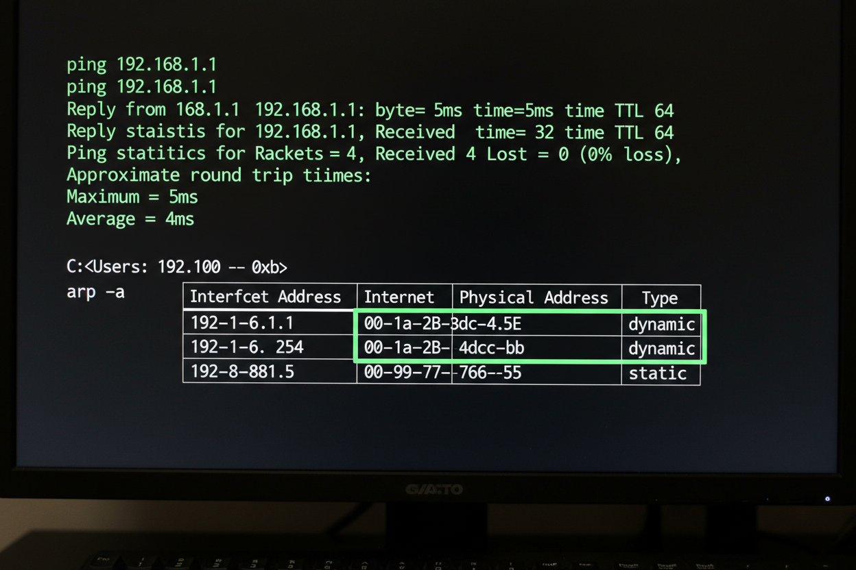 ping-Befehl, um eine Verbindung zum Zielgerät herzustellen. Dies aktualisiert den ARP-Cache Ihres Systems mit der IP- und MAC-Adresse des Zielgeräts. Beispiel:ping 192.168.1.100(ersetzen Sie die IP-Adresse durch die des Zielgeräts). - ARP-Cache anzeigen: Nach erfolgreichem Ping geben Sie den Befehl