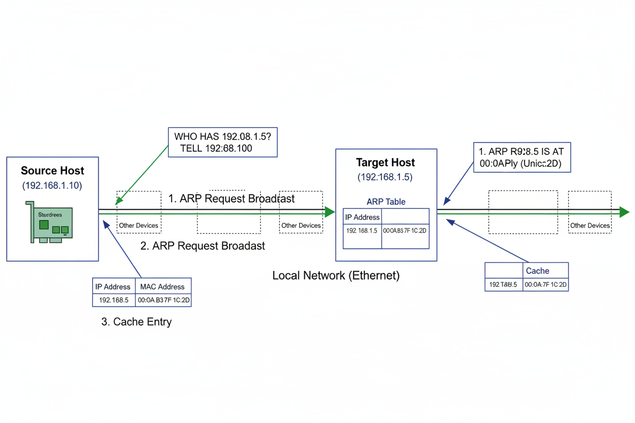 ARP operiert auf der Vermittlungsschicht (Schicht 3) und der Sicherungsschicht (Schicht 2) des OSI-Modells und ist unverzichtbar für die IP-Kommunikation in lokalen Netzwerken. Wenn ein Gerät eine IP-Paket an eine andere IP-Adresse im selben Netzwerk senden möchte, aber die zugehörige MAC-Adresse nicht kennt, sendet es eine ARP-Anfrage. Diese Anfrage ist ein Broadcast-Paket, das alle Geräte im lokalen Segment erreicht und fragt: „Wer hat die IP-Adresse X.X.X.X? Bitte sende deine MAC-Adresse an mich.“